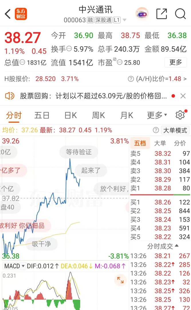 该利好发布后,效果立竿见影。午后开盘,中兴通讯股价迅速拉升翻红。截至记者13点26分发稿,中兴通讯A股报38.27元/股,上涨1.19%,总市值超1800亿元。