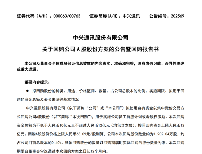 中兴通讯公告称,拟使用自有资金以集中竞价交易方式回购公司A股股份,用于实施公司员工持股计划或者股权激励。本次回购资金总额为不低于10亿元且不超过12亿元(均包含本数)。