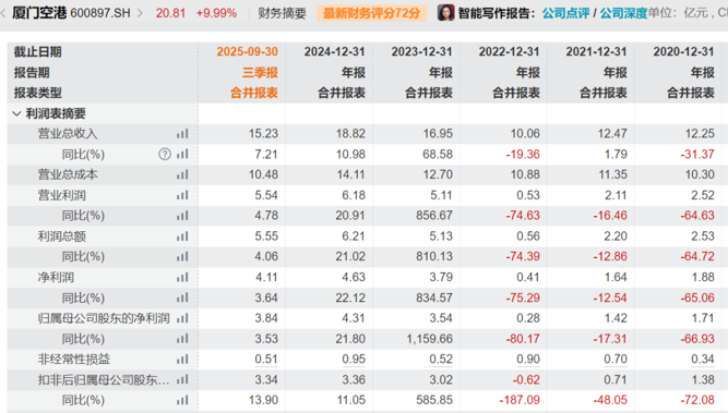 业绩方面,今年前三季度,厦门空港实现营业收入15.23亿元,同比增长7.21%;归属于母公司所有者的净利润为3.84亿元,同比增长3.53%。