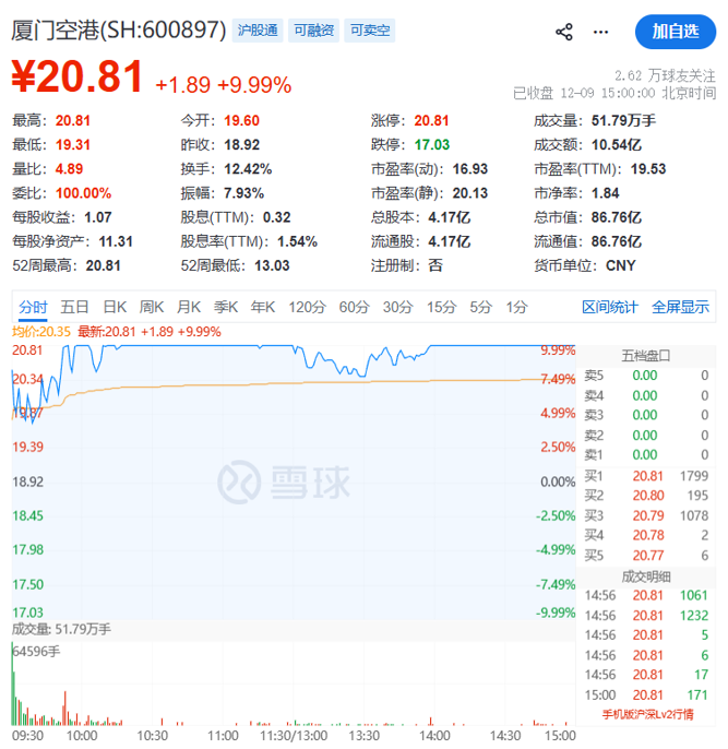 12月9日,厦门空港股价涨停,截至收盘,该股报20.81元/股,总市值为86.76亿元。
