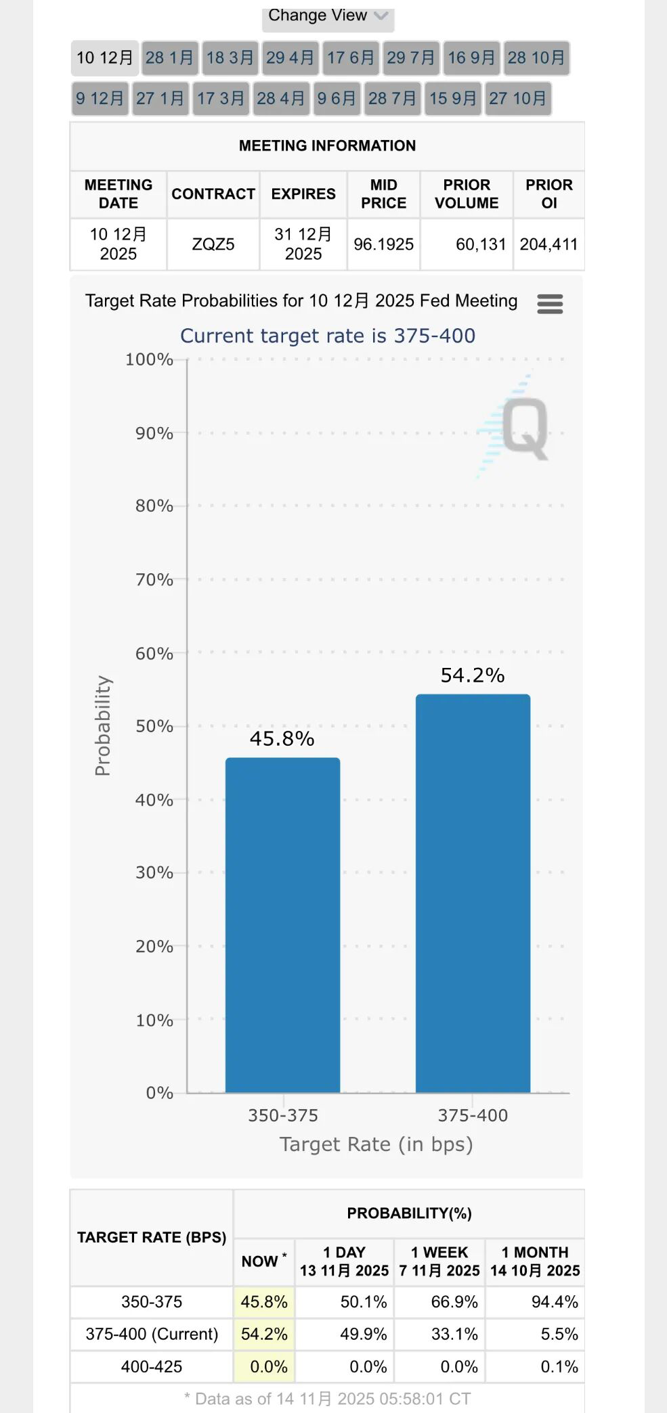 而12月份降息25个基点的概率已从一个月前的94.4%持续下降,降至45.8%。