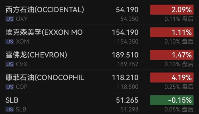 能源股普遍上涨,埃克森美孚涨超1%,雪佛龙涨逾1%,康菲石油涨超4%,斯伦贝谢(SLB)跌0.15%,西方石油涨逾2%。