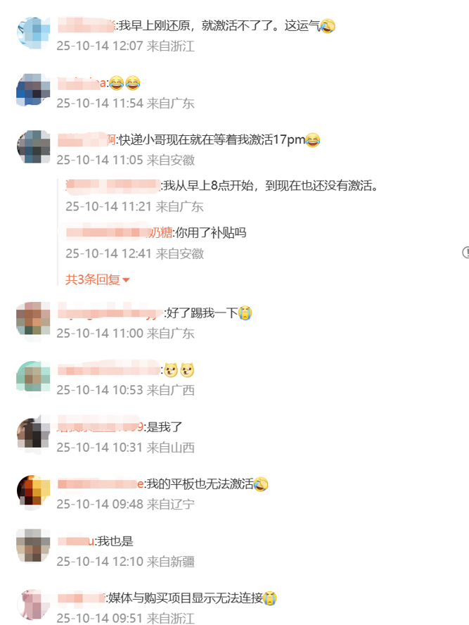 有网友尝试连接WiFi、手机SIM卡、旧手机热点等方式,均未能成功激活。一位来自北京的用户表示,自己通过政府补贴渠道购买的手机,按规定需由快递员当面拆封并激活。由于服务器故障,在与快递员共同尝试了一个小时后仍无法完成激活,最终快递员只能将手机收回。