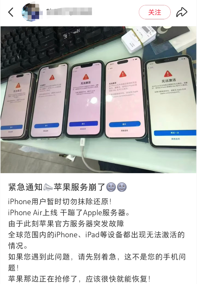 有网友在社交平台上晒出各种苹果服务器故障原因,包括iPhone Air上线、运营商相关问题等,但尚未得到官方证实。