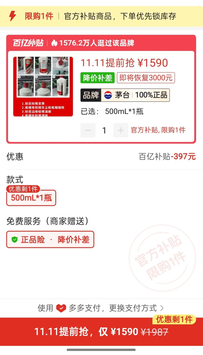 11月4日,中国基金报记者注意到,在拼多多平台上,“百亿补贴”后飞天茅台的价格已跌破1600元/瓶,下探至1590元/瓶。