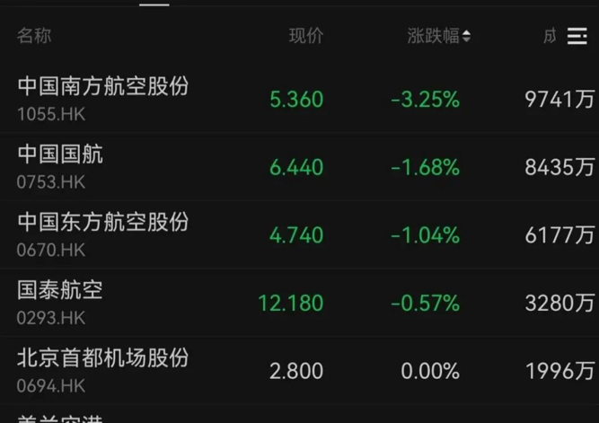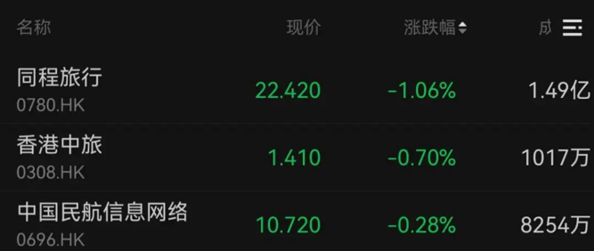 港股中国南方航空股份、中国国航、中国东方航空股份分别下跌3.25%、1.68%、1.04%,同程旅游、香港中旅、中国民航信息网络分别下跌1.06%、0.70%、0.28%。