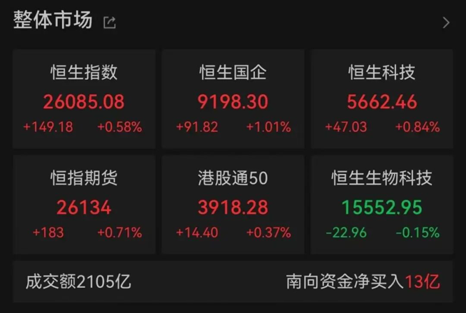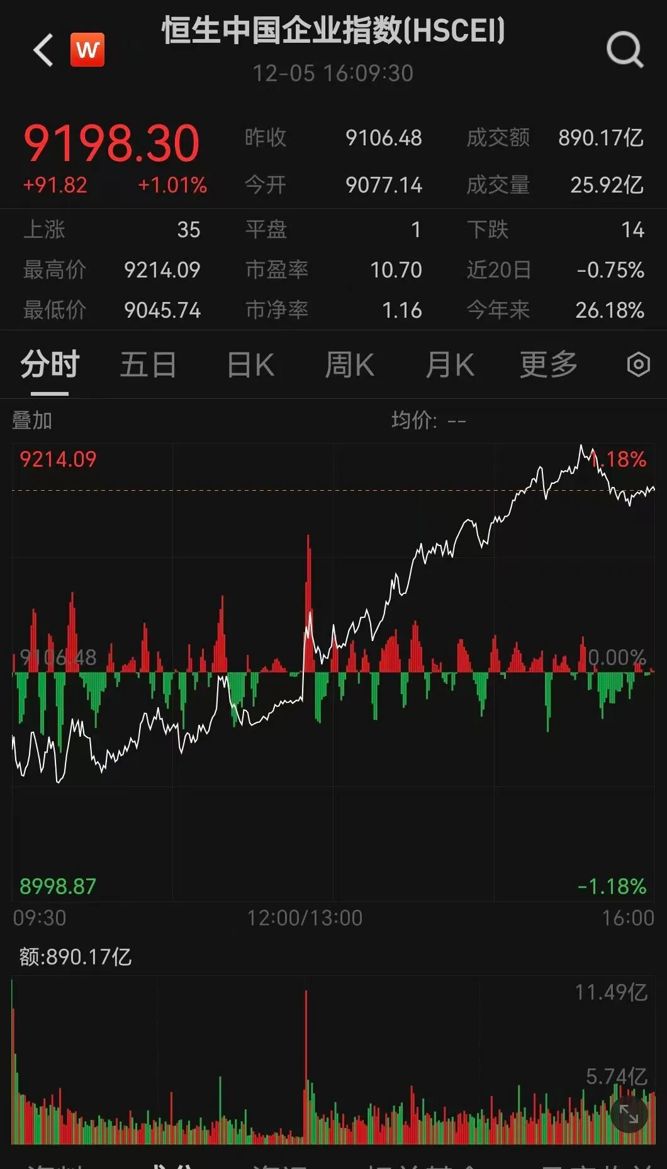 12月5日,港股三大指数午后持续拉升转涨,全天呈现低开高走行情。截至收盘,恒生指数上涨0.58%,再度站上26000点;恒生国企指数、恒生科技指数分别上涨1.01%、0.84%。