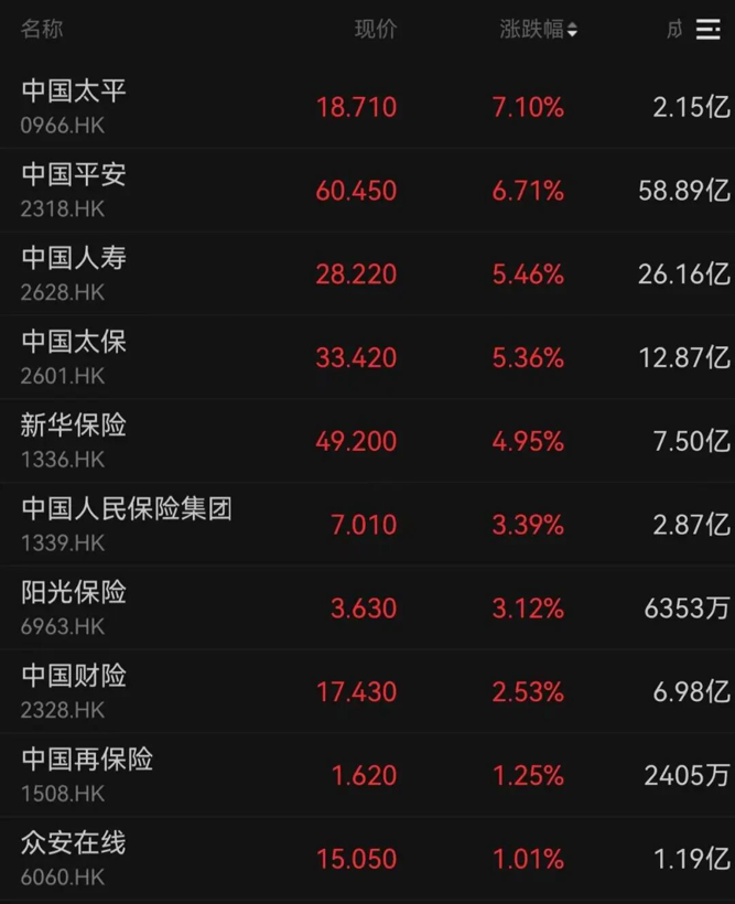 大金融板块中,保险股涨幅最为靠前。中国太平涨超7%,中国平安涨6.71%。
