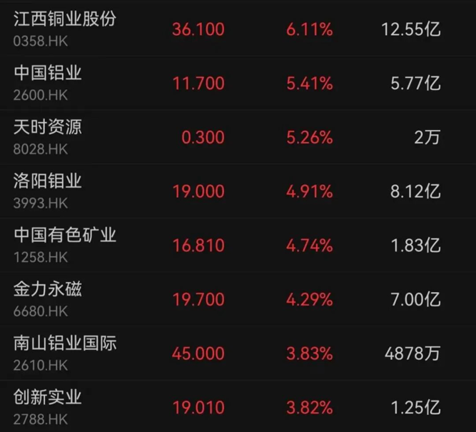 截至收盘,江西铜业股份上涨6.11%、中国铝业上涨5.41%、金力永磁上涨4.29%。