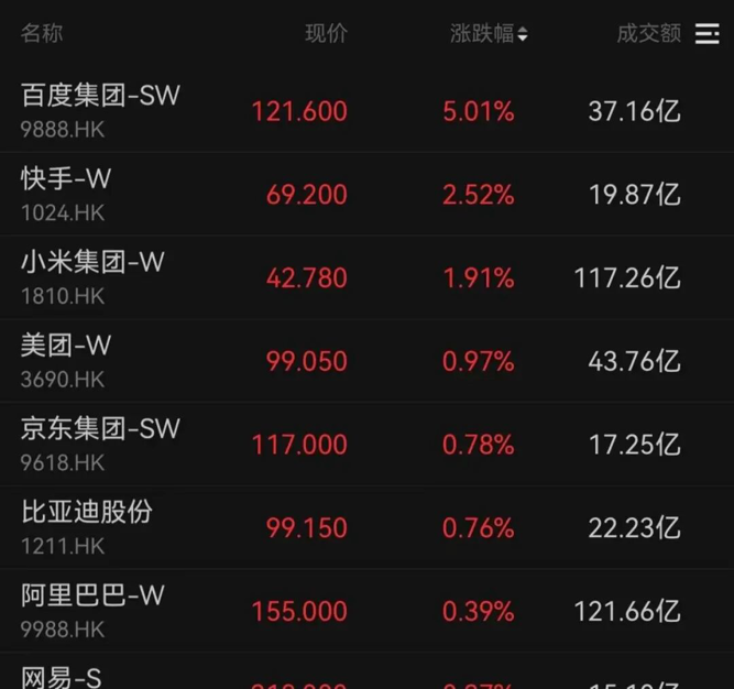 百度涨超5%,领涨科技龙头股;快手、小米、美团等均收涨。