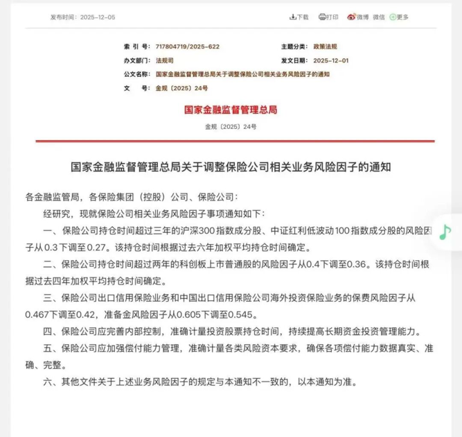 下午3点40分许,国家金融监管总局发布公告,调整保险公司投资相关股票的风险因子。