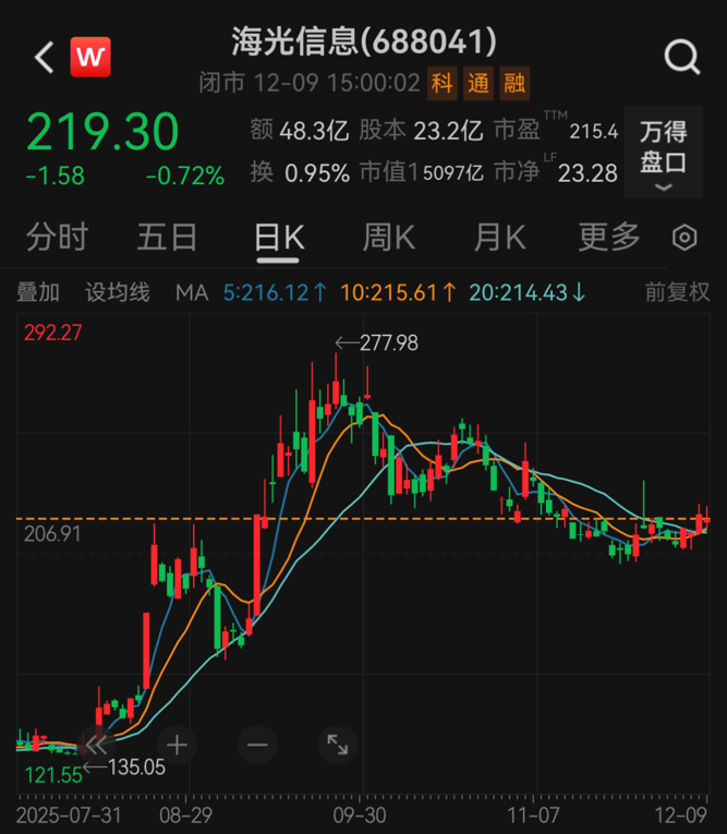12月9日,中科曙光股价以100.13元/股报收,最新市值为1465亿元;海光信息股价以219.3元/股报收,最新市值为5097亿元。