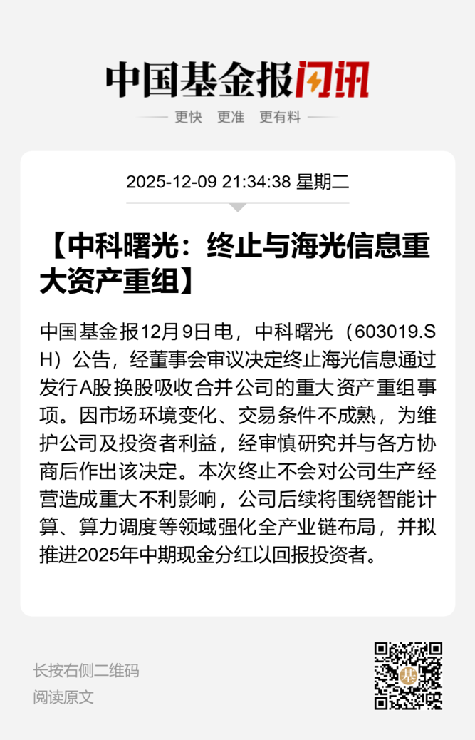【导读】中科曙光、海光信息12月9日晚同时公告,终止重大资产重组