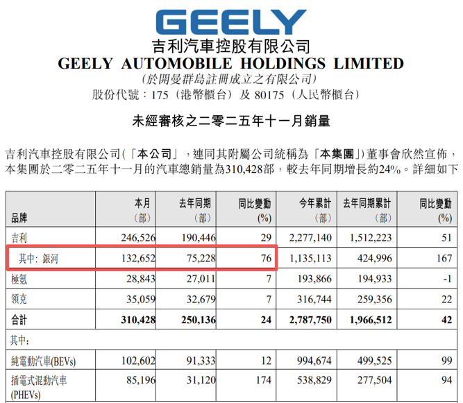 探究可见,吉利汽车的新能源汽车销量主要来自吉利银河,系吉利汽车推出的中高端新能源汽车品牌。2025年11月,吉利银河的销量达13.27万辆,同比增长76%。