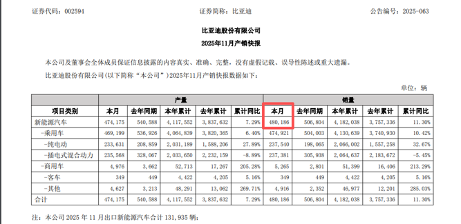 比亚迪2025年11月的销量达48.02万辆,仍未能突破月销50万辆的关口。
