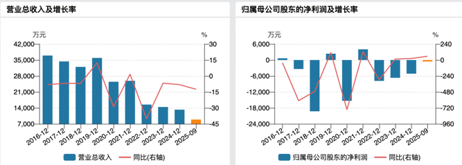 财务数据显示,2022—2024年,公司营业收入分别为1.55亿元、1.46亿元和1.32亿元,呈逐年下滑态势;归母净利润分别为-7855.74万元、-6699.83万元和-5139.74万元。2025年前三季度,公司实现营业收入8898.98万元,归母净利润为-566.48万元,尚未实现扭亏为盈。