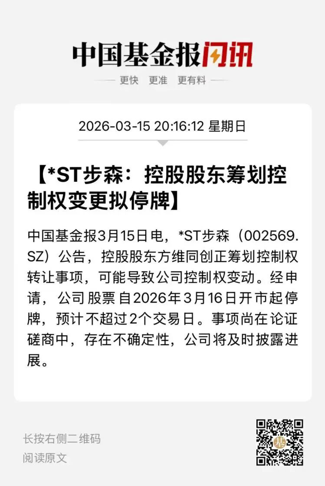 3月15日,*ST步森公告称,公司控股股东方维同创正在筹划重大事项,该事项可能导致公司控制权发生变动。