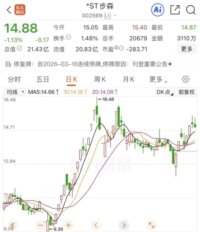 截至3月13日收盘,*ST步森报14.88元/股,最新市值为21.43亿元。