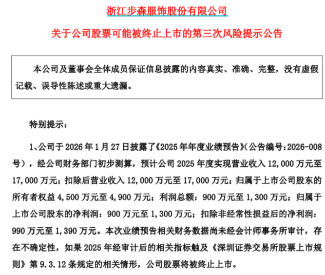 2026年3月4日,*ST步森发布第三次风险提示公告表示,上述2025年度业绩数据尚未经审计,若经审计后的2025年营业收入最终未达到3亿元的“红线”,公司股票将面临终止上市风险。