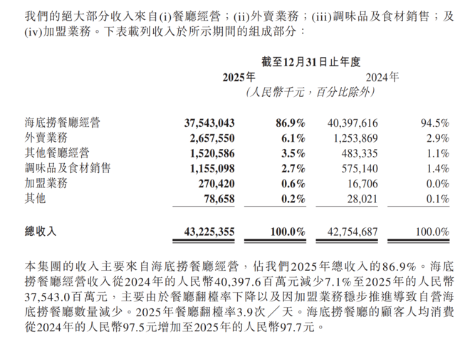 2025年全年,海底捞共接待顾客3.84亿人次,较上年下降7.5%。