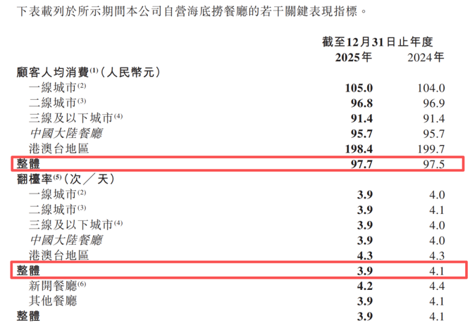 年报显示,2025年,海底捞自营餐厅整体客单价为97.7元,较上年基本持平。翻台率为3.9次/天,而上年同期为4.1次/天。