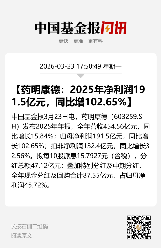 3月23日晚间,全球CXO龙头药明康德(证券代码:603259)披露2025年年报,归母净利润同比增长102.65%至191.51亿元,拟向全体股东每10股派发现金红利15.7927元(含税)。