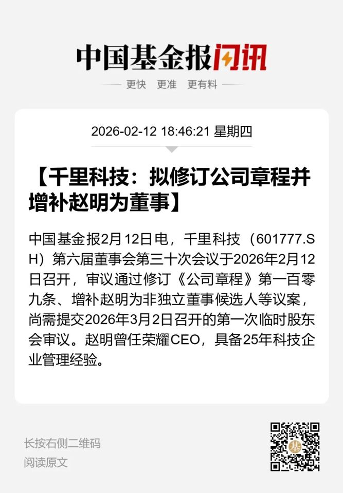 【导读】千里科技将增设联席董事长,提名荣耀前CEO赵明为非独立董事候选人