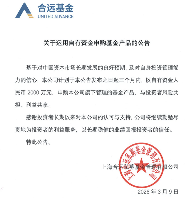 3月9日,合远基金发布公告称,基于对中国资本市场长期发展的良好预期,以及对自身投资管理能力的信心,公司计划于公告发布之日起三个月内,以自有资金2000万元申购公司旗下管理的基金产品。