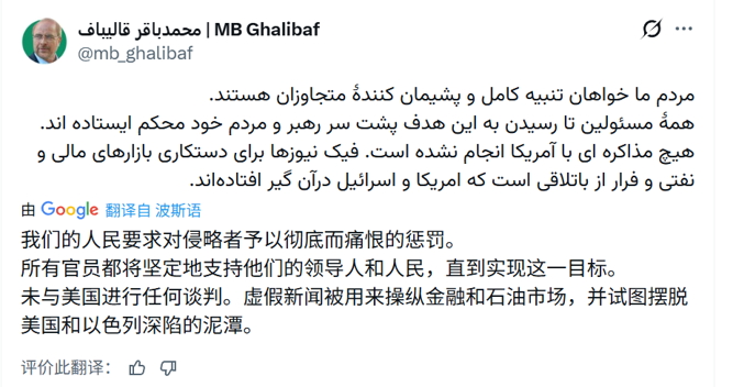 消息面上,又开始反转了!临近深夜12点,伊朗议会议长卡利巴夫发文称,未与美国举行过谈判,“假新闻”被用来操纵石油市场。