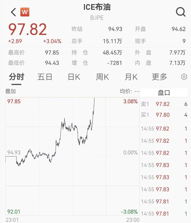 4月16日晚间,国际油价再度走强。布伦特原油直线拉升,截至发稿,报97.82美元/桶,日内涨幅超3%。
