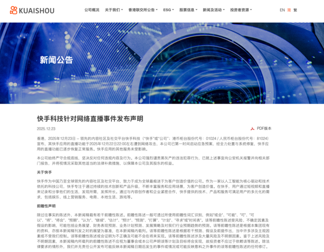 12月23日,快手在官网发布声明称,快手应用的直播功能于2025年12月22日22:00左右遭到网络攻击,公司已第一时间启动应急预案,经全力处置与系统修复,快手应用的直播功能已逐步恢复正常服务。快手应用的其他服务未受影响。