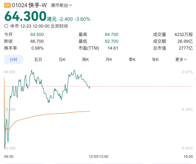 12月23日,快手港股开盘一度跌超5.5%,午盘收报64.3港元/股,下跌3.6%,与昨日相比,市值蒸发超百亿港元。