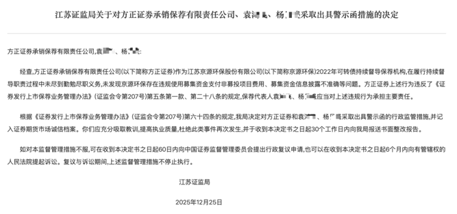 12月26日,江苏证监局发布一则监管措施决定,直指方正证券承销保荐有限责任公司(以下简称方正证券承销保荐)在持续督导工作中未尽到勤勉尽职义务,公司及两名保代被出具警示函。
