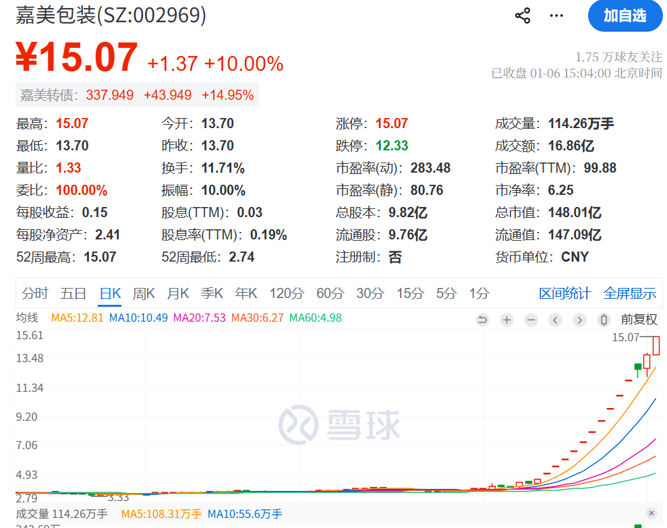 16天12板嘉美包装:公司股票短期内价格涨幅较大 1月7日起停牌核查
