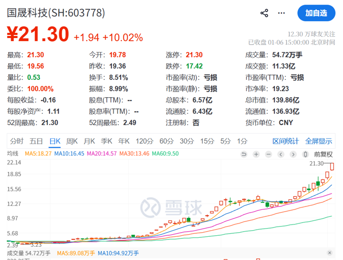 国晟科技公告称,2025年10月31日至2026年1月6日期间,公司股票5次触及股价异常波动、1次触及严重异常波动情形,累计涨幅高达370.20%,公司股价累计涨幅偏离基本面,存在市场情绪过热、非理性炒作风险,存在股价短期快速回落风险。为维护广大投资者利益,根据相关规定,经向上海证券交易所申请,本公司股票将于2026年1月7日(星期三)开市起停牌,预计停牌时间不超过3个交易日,公司股票将自披露核查公告后复牌。