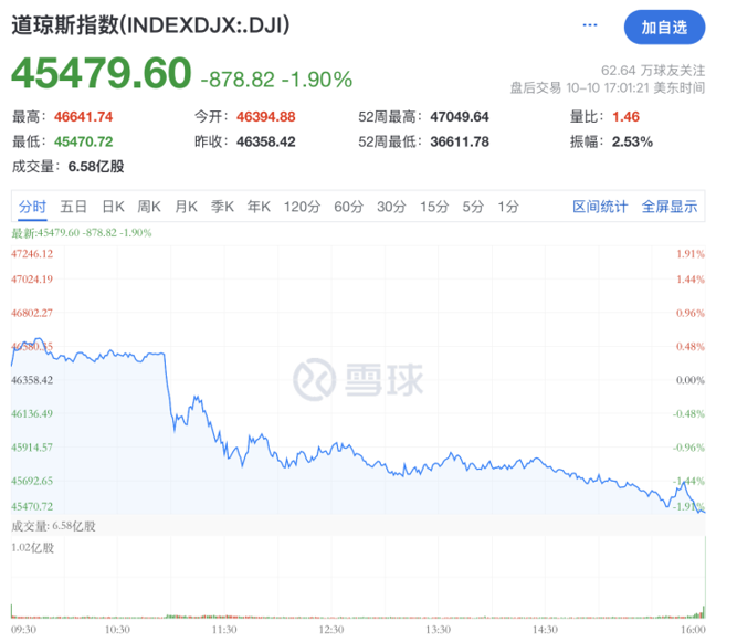 道琼斯指数收跌1.9%,报45479.6点。本周跌2.73%。