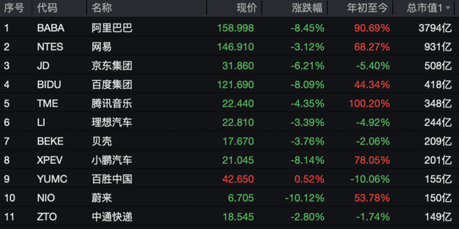 阿里巴巴跌8.45%,现报158.998美元/股;哔哩哔哩跌超9%,百度集团、小鹏汽车跌超8%,京东集团跌超6%,网易、理想汽车、贝壳等跌幅居前。