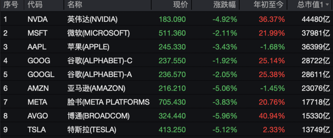 大型科技股普跌,万得美国科技七巨头指数跌3.65%。