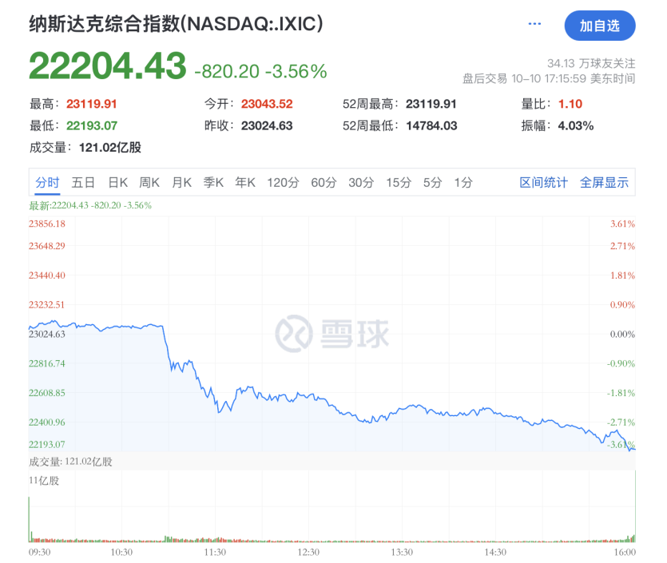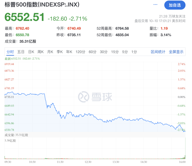 纳斯达克指数大跌3.56%,报22204.43点;标普500指数收跌2.71%,报6552.51点,均创4月10日以来最大单日跌幅。