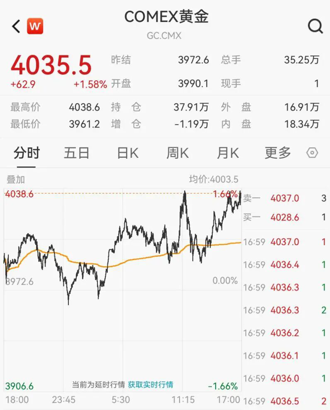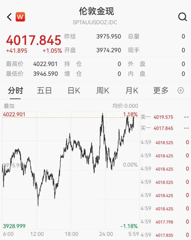 现货黄金上涨1%,最高至4022.901美元/盎司,收报4017.845美元/盎司;纽约期金上涨1.58%,报4035.5美元/盎司。