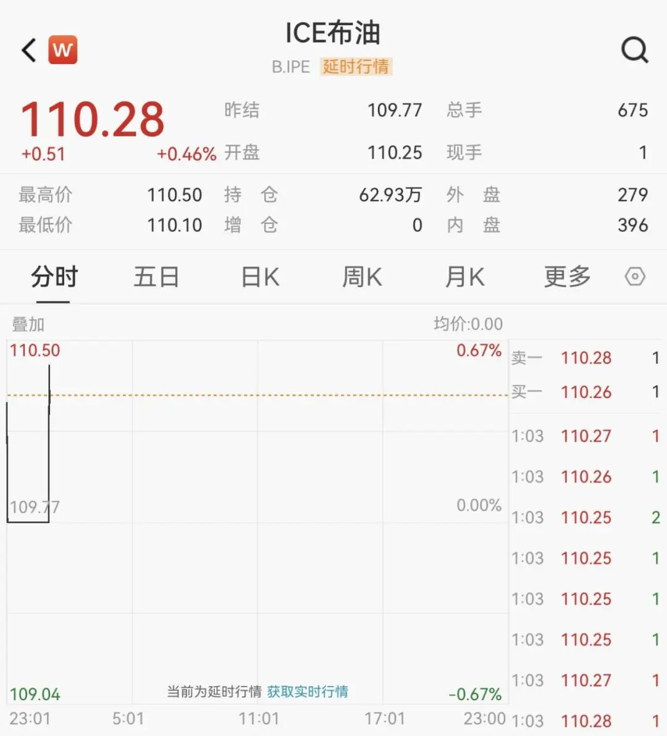 4月7日早间,原油期货直线拉升,布伦特原油期货升至110.28美元/桶,日内上涨0.46%。
