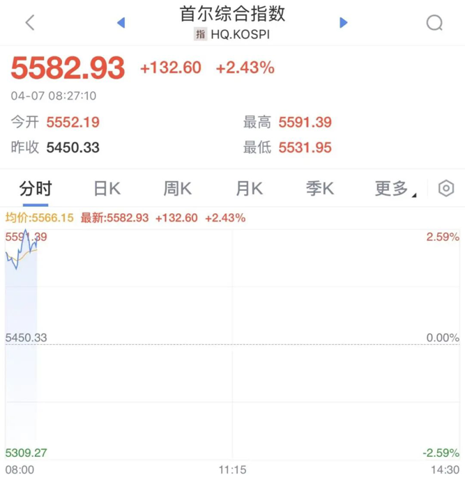 4月7日,日韩股市开盘走高,韩国综合指数涨超2%,最新报5582.93点。