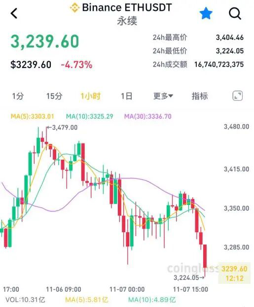 另外,以太坊跌破3300美元,现报3239.6美元/枚,24小时跌幅达4.73%。
