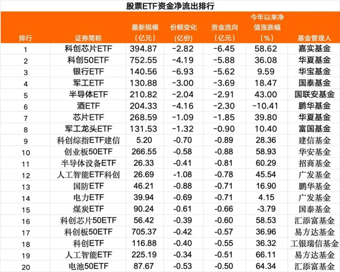 在股票ETF中,当日7只股票ETF净流出超过1亿元,部分行业主题净流出靠前,科创50、科创综合等宽基ETF,以及科创芯片、银行、军工等行业主题ETF是资金净流出较多的品种。