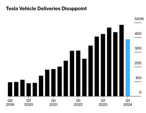 自新冠疫情以来,特斯拉公司销量首次出现同比下降。2024年前三个月交付了386810辆车。这远远低于分析师平均预期的449080辆交付量。这是自2022年第三季度以来的最低交付量,同比更是下滑8.5%
