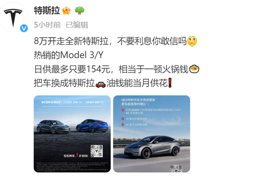 特斯拉中国宣布,针对Model 3/Y车型上线限时低息置换政策,并首次推出“0利息”分期购车的优惠政策。据悉,4月底前下订最新款的Model 3/Y车型,最长可享3年0息或5年超低息。以3年36期免息举例,只需7.99万元首付,便可开走一台Model Y,日供至多171元。