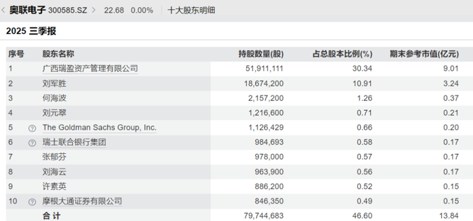 截至三季度末,瑞盈资产持有奥联电子5191.11万股,持股占比为30.34%。