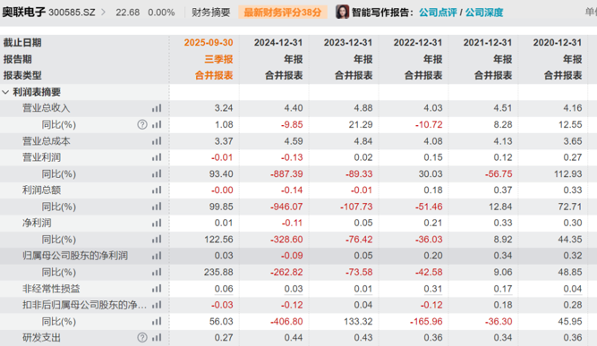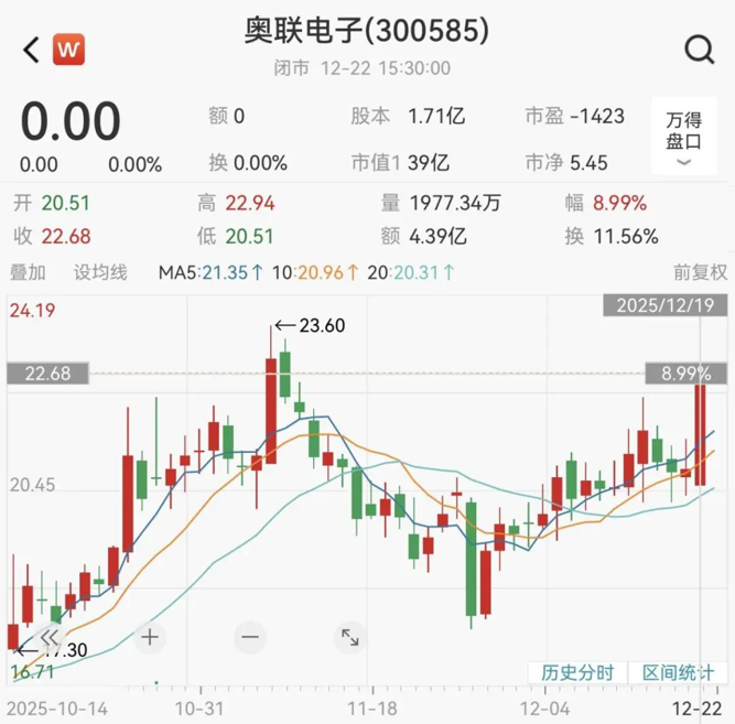 截至12月19日收盘,奥联电子股价报22.68元/股,总市值为39亿元。