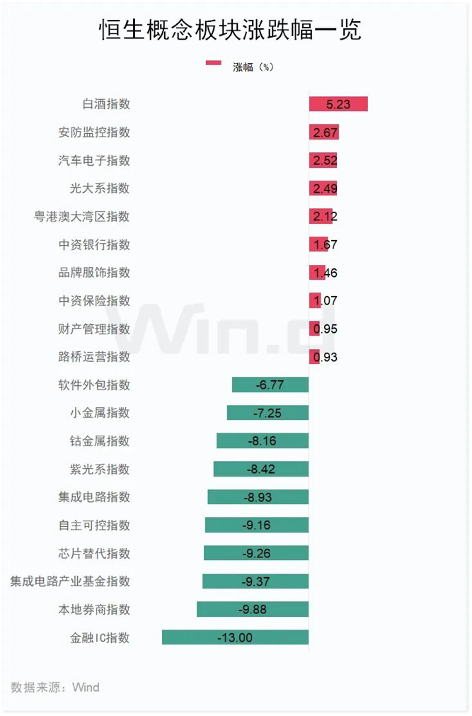 从盘面来看,Wind概念板块多数下跌,金融IC指数跌13.00%,本地券商指数跌9.88%,集成电路产业基金指数跌9.37%;涨幅方面,白酒指数涨5.23%,安防监控指数涨2.67%,汽车电子指数涨2.52%。