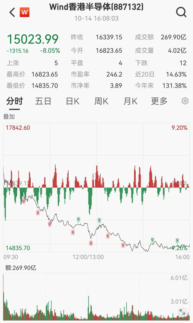 半导体行业明显回调。Wind香港半导体板块指数一度大跌9.20%,收盘跌8.05%。